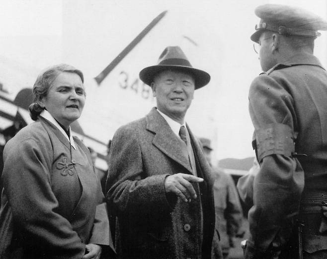 | ▲ 대구 순시를 위해 공항에 나온 이승만 대통령 부부. 1951.3.23 |