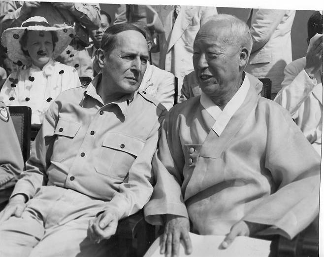 | ▲ 1948. 8. 15. 서울, 대한민국 정부수립기념 식장에서 담소하는 맥아더 미 극동군사령관과 이승만 대통령. |