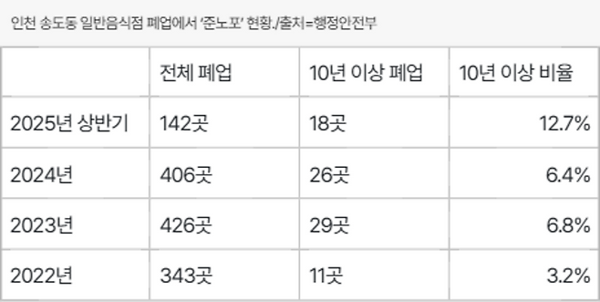 올 들어 6월까지 송도동에 142곳 일반음식점이 문을 닫을 동안 12.7%(18곳)는 업력 10년 이상 식당이 차지했다. 작년엔 전체 폐업 406곳에서 6.4%(26곳), 2023년엔 폐업 426곳에서 6.8%(29곳)와 비교하면 몸집이 배 가까이 불었다.
