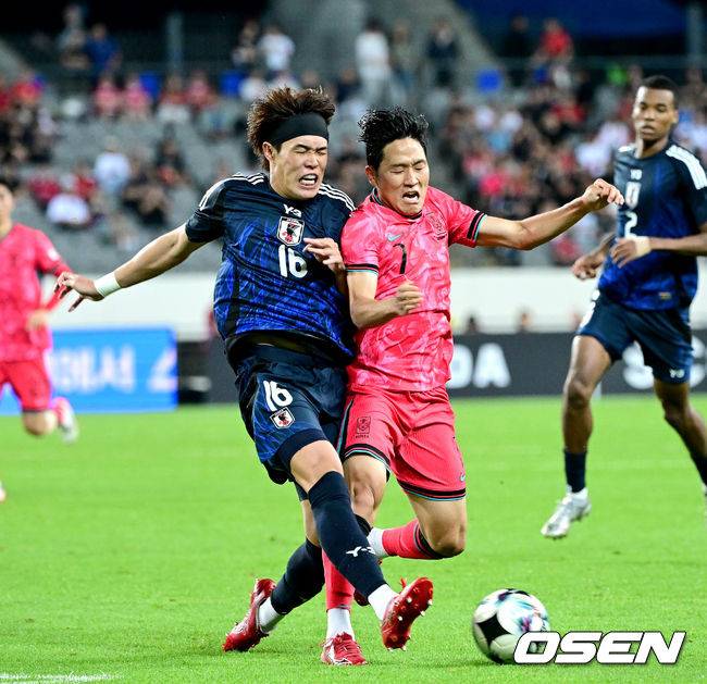 후반 한국 나상호와 일본 안도 토모야가 몸싸움을 벌이고 있다. 2025.07.15 / dreamer@osen.co.kr