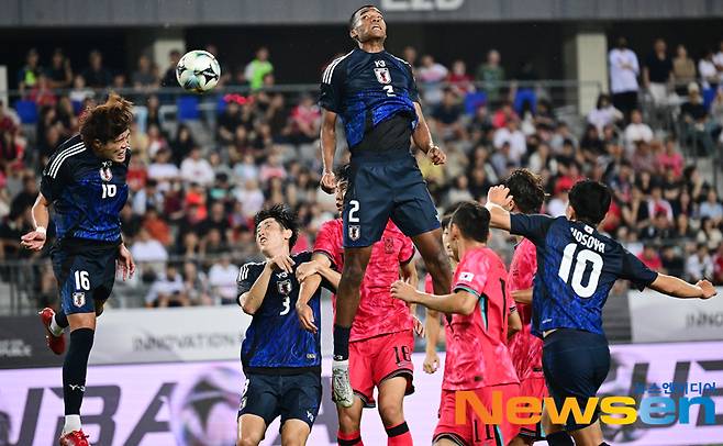이날 후반 일본 모치즈키가 헤더볼을 다투고 있다.