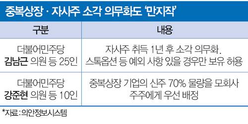 더불어민주당은 자사주도 손댈 예정이다. 기업이 자사주를 매입할 경우 취득 후 1년 이내 소각하도록 하는 상법 개정안을 발의했다. 이재명 대통령이 지난 대선 과정에서 상장 회사 자사주를 원칙적으로 소각해 주주 이익으로 환원될 수 있도록 제도화하겠다고 밝힌 데 따른 조치다.