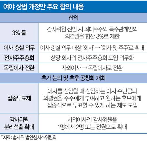 여야 합의로 통과시킨 개정 상법은 이사의 충실 의무를 회사에서 주주로 확대하고 감사위원 선출 시 대주주 영향력을 제한하는, 이른바 ‘3% 룰’ 등을 담았다. 윤석열정부가 거부권을 행사해 폐기된 기존 법안보다 더 강력해졌다. 여야는 ‘사외이사’를 감사위원으로 선출할 때도 대주주 및 특수관계인 의결권을 3%로 제한하기로 했다. 현재 ‘사내이사’를 감사위원으로 선출할 때 적용하는 3% 룰을 확대했다.