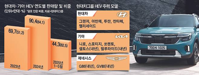 현대차와 기아의 친환경 차량 판매는 계속해서 증가하고 있는 추세인데, 그 중심에는 하이브리드 차량이 있다. 2022년 전기차의 약진에 따라 하이브리드 비율이 50% 밑으로 떨어지기도 했으나, 작년에는 캐즘으로 인해 다시 64.1%로 절대 다수를 차지하기에 이르렀다.