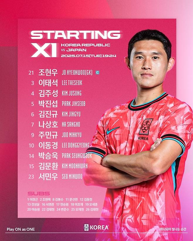 이날 한국은 최전방에 주민규(대전)가 선발 출격했고, 오른쪽 측면에는 중국전 득점 주인공 이동경(김천), 왼쪽에는 나상호(마치다 젤비아)가 섰다.