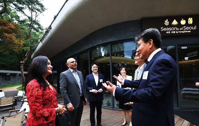 [서울=뉴시스] 오승록 노원구청장이 15일 오후 서울 노원구 수락산 자연휴양림 ‘수락휴’에서 열린 ‘주한외국대사 초청행사’에서 대사들을 맞이하고 있다. (사진=노원구청 제공) 2025.07.15. photo@newsis.com *재판매 및 DB 금지