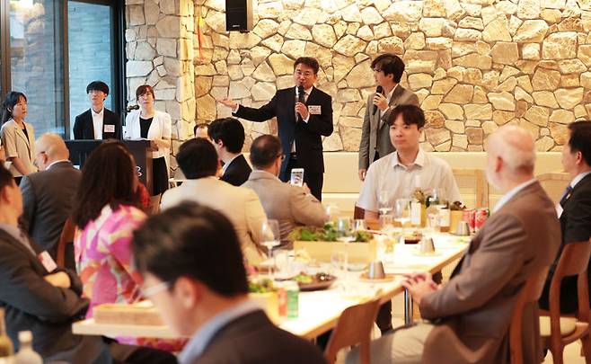 [서울=뉴시스] 오승록 노원구청장이 15일 오후 서울 노원구 수락산 자연휴양림 ‘수락휴’에서 열린 ‘주한외국대사 초청행사’에 참석해 인사말을 하고 있다. (사진=노원구청 제공) 2025.07.15. photo@newsis.com *재판매 및 DB 금지