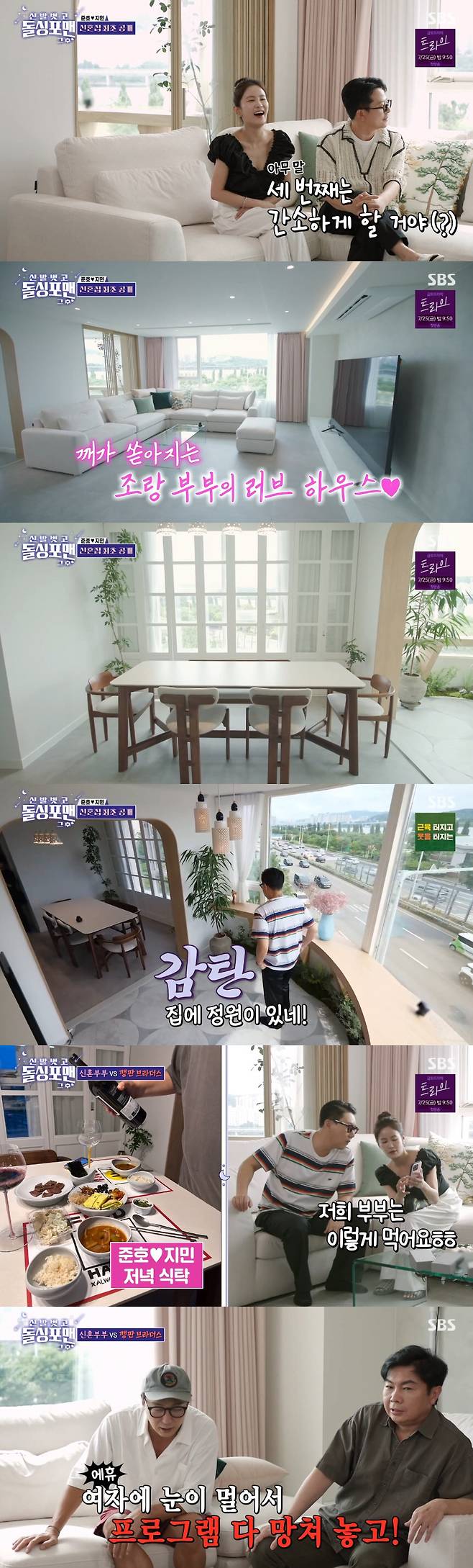 이후 '돌싱포맨' 멤버들이 김준호, 김지민 부부의 신혼집에 도착했다. 한강뷰가 보이는 넓은 거실과 세련된 다이닝룸, 식탁 옆 한쪽에 마련된 로맨틱한 공간까지 달달한 분위기가 물씬 풍기는 신혼집에 멤버들은 감탄을 금치 못했다. 이상민은 "여기 모델 하우스 아니냐"며 "집에 정원도 있다"며 감탄했다. 하지만 탁재훈은 연신 심술 가득한 표정으로 태클을 걸어 웃음을 안겼다.