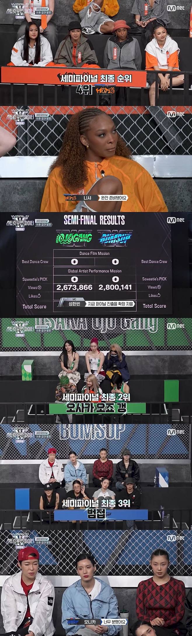 15일 방송된 Mnet '월드 오브 스트릿 우먼 파이터'(이하 '월드 오브 스우파(WSWF)') 8회에서는 에이지 스쿼드(AG SQUAD), 범접(BUMSUP), 모티브(MOTIV), 오사카 오죠 갱(OSAKA Ojo Gang) 네 크루 가운데 파이널로 진출할 세 크루가 정해졌다.