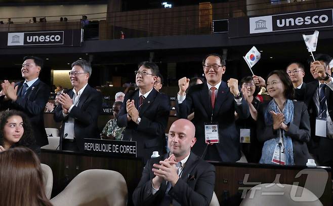 (파리(프랑스)=뉴스1) 이준성 기자 = 최응천 국가유산청장과 정부대표단, 부산시 관계자 등이 16일(한국시간) 프랑스 파리 유네스코 본부에서 열린 제47차 유네스코 세계유산위원회에서 차기 세계유산위원회 개최지로 대한민국 부산이 확정되자 환호하고 있다. 2025.7.16/뉴스1