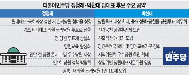이재명정부 초대 당대표 선거에 출마한 정청래·박찬대 후보 간 권리당원 표심용 공약 경쟁 수위가 높아지고 있다.
