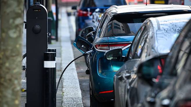 ▲ 전기차가 영국 런던의 도로변 충전소에서 충전되고 있다.