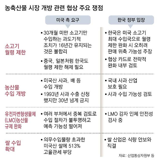 한국은 2008년 광우병 사태 이후 지금껏 30개월령 이상 미국산 소고기 수입을 제한하고 있다. 30개월령 이상 소에서 광우병(BSE)의 원인으로 지목되는 위험 물질 검출 가능성이 크다고 알려졌기 때문이다. 당시만 해도 여러 국가가 한국과 비슷한 수준의 규제를 가했지만, 최근에는 상황이 달라졌다. 미국산 소고기의 안전성이 확인되면서 일본(2019년)과 중국(2020년), 대만(2021년) 등이 차례로 규제를 풀었다. 지금은 전 세계에서 러시아와 벨라루스를 제외하면 한국만 미국산 소고기 월령 제한을 유지하고 있다.