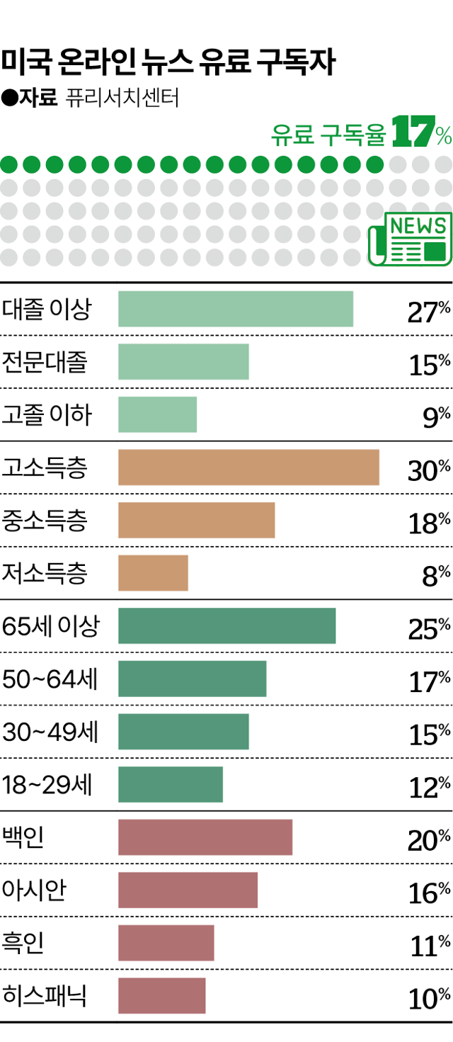 미국에서는 온라인 유료 뉴스 이용자 비율이 17%에 달하는 것으로 나타났다. 또 고등교육을 받고 경제적 여유가 있을수록, 유료 구독 서비스에 적극 참여하고 있다.