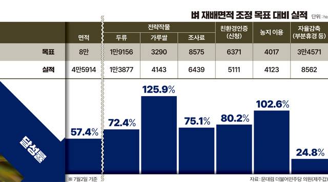 실제 농가가 선호하는 쌀농사를 다른 농사로 전환하는 것은 그동안 전례에 비춰볼 때 쉽지 않은 일이다. 문대림 더불어민주당 의원(제주갑)에 따르면 올해 농림축산식품부가 8만㏊를 목표로 추진한 ‘벼 재배면적 조정제’ 실적은 7월2일 기준 4만5914㏊로 목표치의 57.4%에 그쳤다. 각 지방자치단체가 이행하겠다고 밝힌 계획이 이 정도로, 실제 이행 실적은 더 줄어들 수 있다.
