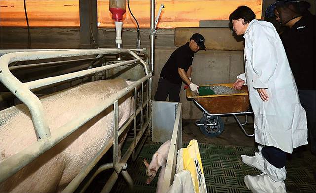 송미령 농림축산식품부 장관이 13일 충남 홍성의 한 양돈농가를 방문해 폭염 피해 대응 상황을 점검하고 있다.