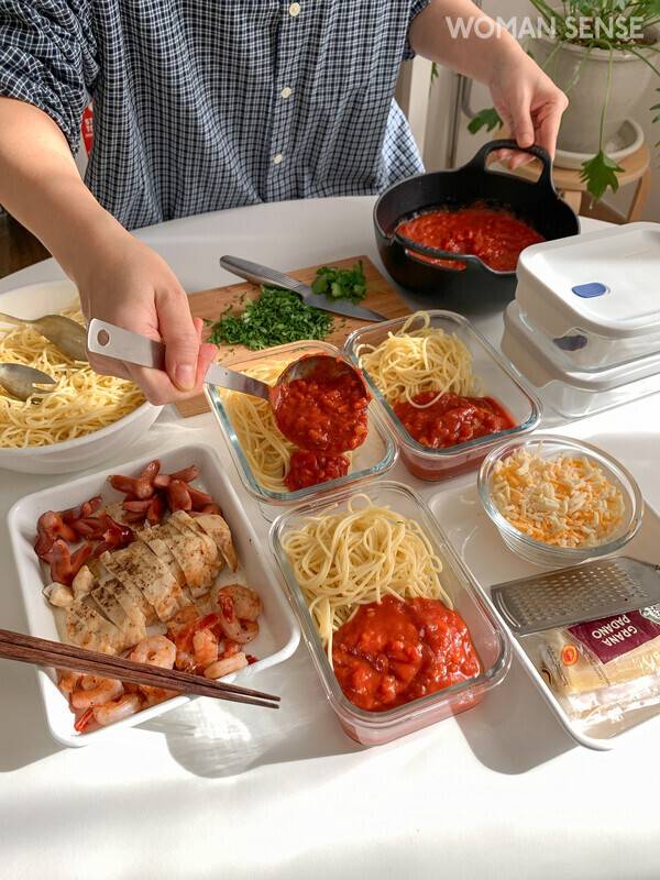 한꺼번에 많이 만들어 두고 냉동 보관하면 바쁜 아침이나 야식으로 유용하다. 토핑을 곁들이면 한 끼 분량 도시락이 완성된다. 토마토파스타 밀프렙의 기본 구성은 토마토파스타 1⅓컵과 삶은 스파게티 200g (삶기 전 83g), 토핑이다.