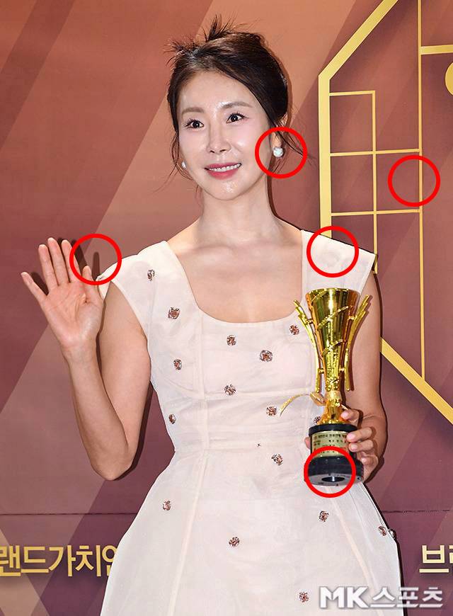 한류스타대상 트로피를 들고 포즈를 취하고 있는 한다감의 사진에서 다른 부분 5군데를 찾아보세요.