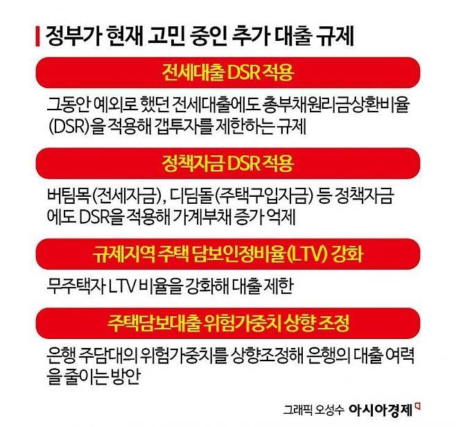 이 밖에도 정부는 버팀목이나 디딤돌과 같은 정책자금에도 DSR을 적용하는 방안과 규제 지역에 LTV를 더 강화하는 방안 등도 고려 중이다. 현재 무주택자 LTV는 규제지역에 최대 50%, 비규제지역에 70%까지 적용되는데, LTV 비율을 더 조여 대출 한도를 줄이겠다는 것이다. 주택담보대출의 위험 가중치를 상향해 은행의 대출 여력을 줄이는 방안도 논의된다. 금융위 관계자는 "가계부채 문제가 해결되지 않는다면 추가 규제가 불가피한 상황"이라고 설명했다.