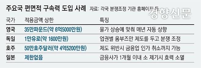 영국·독일·호주·일본 등은 소액사건의 분쟁조정안에 한해 편면적 구속력을 인정하는 체제를 도입했다. 영국은 35만파운드(약 6억5000만원) 이하, 독일은 1만유로(약 1400만원) 이하의 조정안이라면 소비자들의 수락만으로 금융사에 이행 의무를 부과한다. 호주는 금융사가 조정안을 수용하지 않으면 인허가 취소까지 가능하다. 반면 일본은 편면적 구속력을 인정하면서도 금융사가 1개월 이내 소송을 제기하면 분쟁으로 전환할 수 있도록 하는 제한적인 방식을 택했다.
