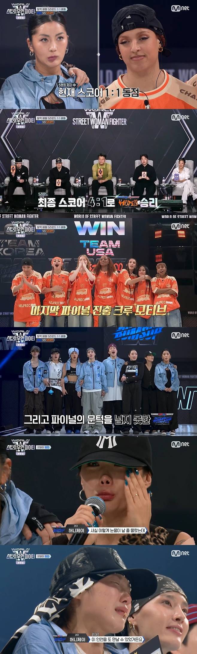 파이널 문턱을 넘지 못한 범접의 리더 허니제이는 "지금까지 잘했어"라며 팀원들을 다독였고, 리헤이는 마지막 라운드를 한 사람으로서 미안함을 표했다.