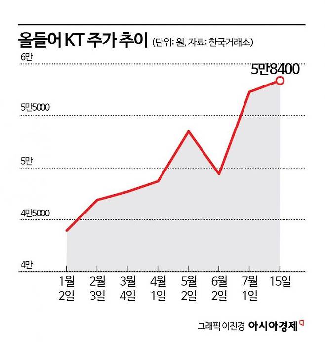 16일 한국거래소에 따르면 KT는 전일 장중 5만9200원까지 올라 52주 신고가를 기록했다. 1.04% 상승한 5만8400원에 마감한 KT는 이달 들어 4.85% 올랐다.