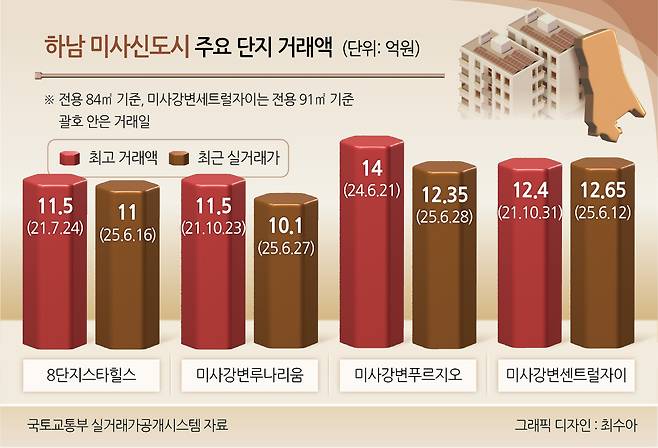 최근 회복세가 가장 두드러지는 단지로는 ‘미사강변8단지 스타힐스(1389가구)’가 꼽힌다. 9호선 연장선이 단지 인근 미사강변북로사거리를 지나갈 예정으로, 수혜 기대감이 커지고 있다. 지난달 84㎡가 11억원에 거래되며 작년 동기 대비 1억원 이상 상승했다.