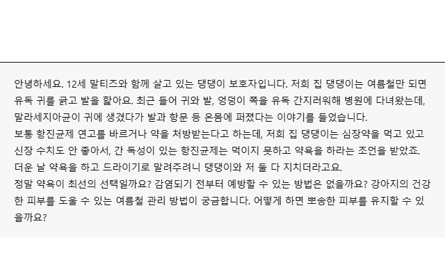 안녕하세요. 경기도 최초 피어프리 전문가 인증 블루베어동물병원 대표원장이자 반려인인 신성우 수의사입니다. 여름철 말라세지아 피부염으로 고생 중인 12세 말티즈 친구와 보호자님의 상황, 충분히 공감됩니다. 말씀주신 대로 심장약과 신장 질환 등으로 인해 일반적인 항진균제 복용이 제한된다면 더 섬세한 관리가 필요할 겁니다. 말라세지아가 무엇인지, 반려견의 피부 건강을 위해 무엇을 해줄 수 있을지 알아볼까요?