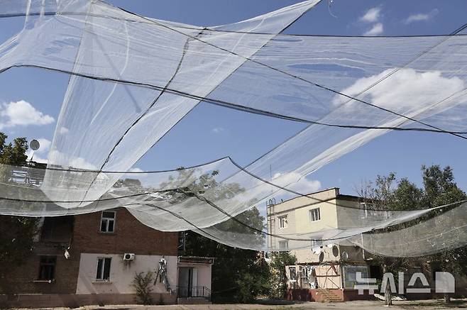 [오리히우=AP/뉴시스] 우크라이나 제65기계화여단이 제공한 사진에 15일(현지 시간) 우크라이나 자포리자주 오리히우 거리 상공에 대(對)드론 그물이 설치돼 있다. 이 그물은 러시아의 소형 드론 공격을 효과적으로 방어하는 역할을 하고 있다. 2025.07.16.