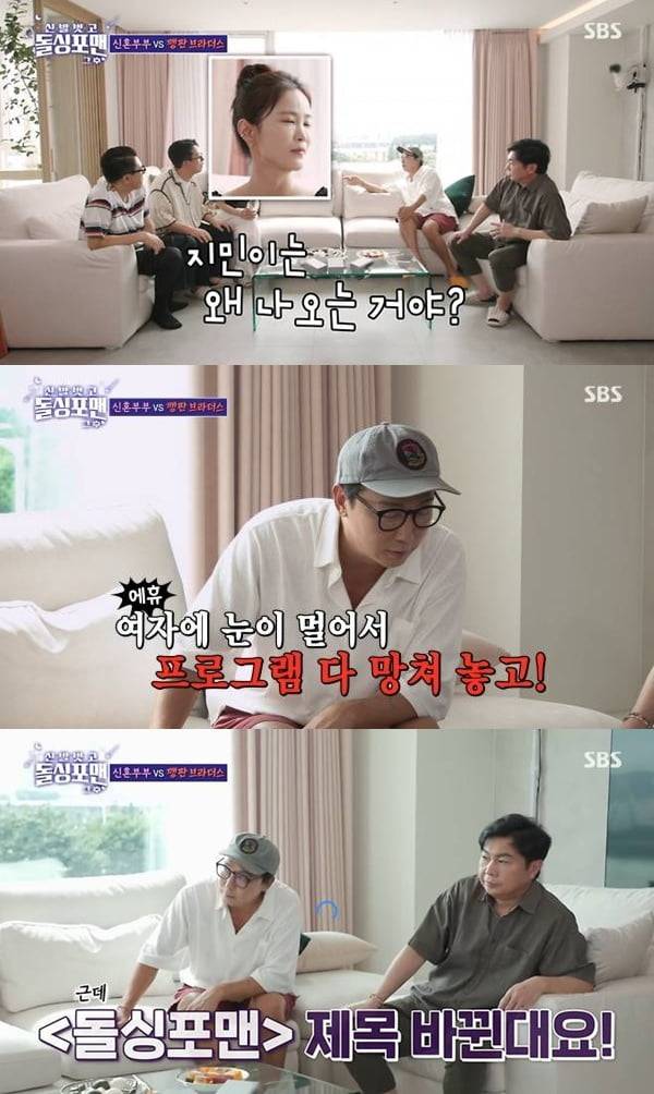탁재훈은 "'돌싱포맨'인데 왜 아내 김지민을 데리고 나왔냐"며 "여자에 눈 멀어서 프로그램 다 망쳐놨다"고 불만을 표했다. 그러면서 "원래 네 명인데 아내 한 명씩 나오면…나 안 한다"고 말했다.