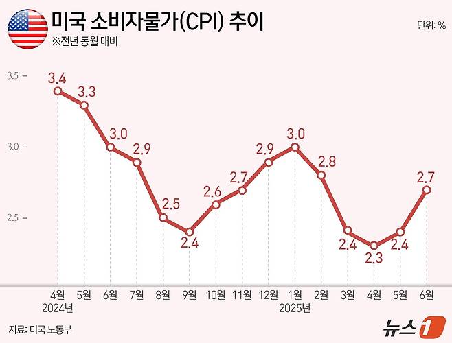 (서울=뉴스1) 김지영 디자이너 = 15일(현지시간) 로이터에 따르면 미국 노동부는 CPI가 전년 동월 대비 2.7% 올랐다고 발표했다. 5월 CPI에 비해서는 0.3% 올라 예상치를 소폭 웃도는 것으로 집계됐다.