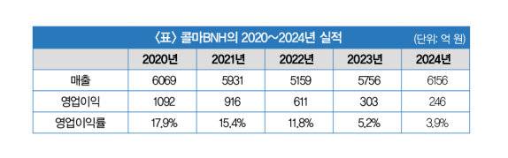 콜마BNH는 특이한 회사다. 지난 2년간 매출은 늘었지만 영업이익은 줄었기 때문이다. 콜마BNH 측 주장대로 2022년 이후 매출은 계속 성장했다. 금융감독원 전자공시(DART)에 따르면 콜마BNH의 매출은 2020~2022년 2년간은 하락세였으나, 2022년 이후 반등했다. 2020년 6069억 원의 매출을 올렸으나 2021년에는 5931억 원으로 줄었다. 2022년에는 5159억 원까지 줄었다. 2023년 반등이 시작됐고, 5796억 원으로 소폭 늘었다. 2024년에는 6156억 원의 매출을 기록하며 2020년의 매출을 앞질렀다.