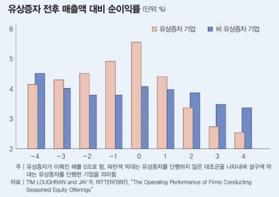 그렇다면 주식시장에서 투자자들이 회사의 '정체' 혹은 '실체'를 파악하는 데 도움이 되는 신호에는 어떤 게 있을까. 오늘의 주제인 유상증자가 가장 대표적이다. 이는 회사에 문제가 생겼다는 부정적 신호라고 봐야 한다. 미국 기업들을 대상으로 한 연구에 따르면 기업들이 유상증자를 단행하기 전에는 우수한 실적을 기록하다가 유상증자를 단행한 다음에는 심각한 실적 악화를 경험하는 경향이 있다고 한다.예를 들어 매출액 대비 순이익률을 조사하면 유상증자가 단행된 해에는 순이익률이 약 6%에 이르지만 그다음 해에는 4% 초반, 2년 차에는 심지어 3% 수준, 그리고 3~4년 차에는 3% 밑으로 추락한 것으로 나타났다(그래프 참조). 실적을 억지로 짜내 주주들로부터 자금을 대규모로 조달한 이후 본 실력이 드러난 셈이다.