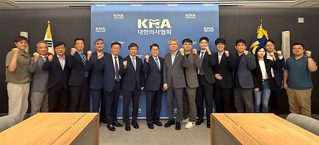[서울=뉴시스] 김택우 대한의사협회장과 대한수련병원협의회, 대한전공의협의회 관계자들이 15일 서울 용산구 대한의사협회에서 열린 전공의 수련재개를 위한 간담회에서 기념촬영을 하고 있다. (사진=대한의사협회 제공) 2025.07.16. photo@newsis.com