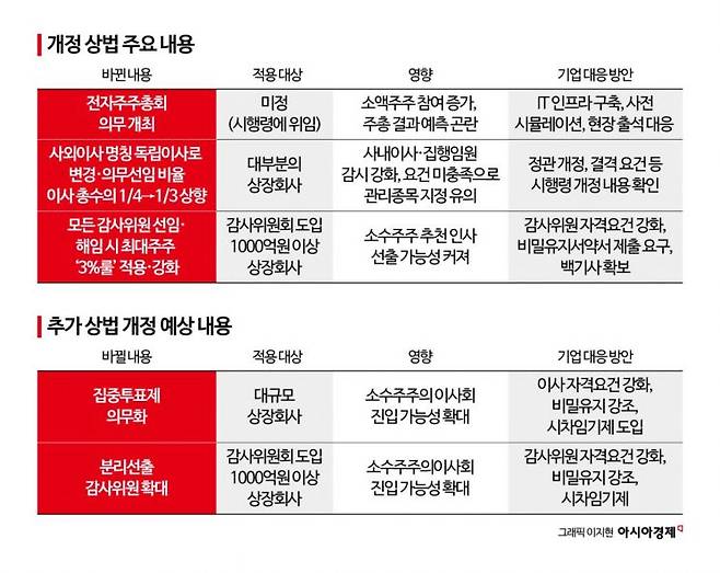 여당은 이번 개정에서 유예된 '집중투표제 의무화' '분리선출 감사위원 확대' 조항도 곧 추가 개정안을 발의해 신속하게 처리하겠다는 입장이다.