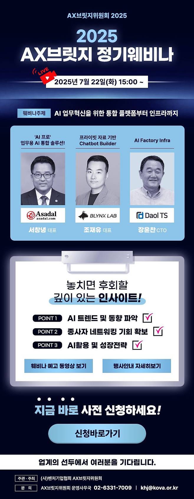 벤처기업협회 산하 AX브릿지위원회는 오는 22일 인공지능 전환(AX)을 준비 중인 벤처기업을 위한 '제1차 AX 정기 웨비나'를 개최한다고 16일 밝혔다.