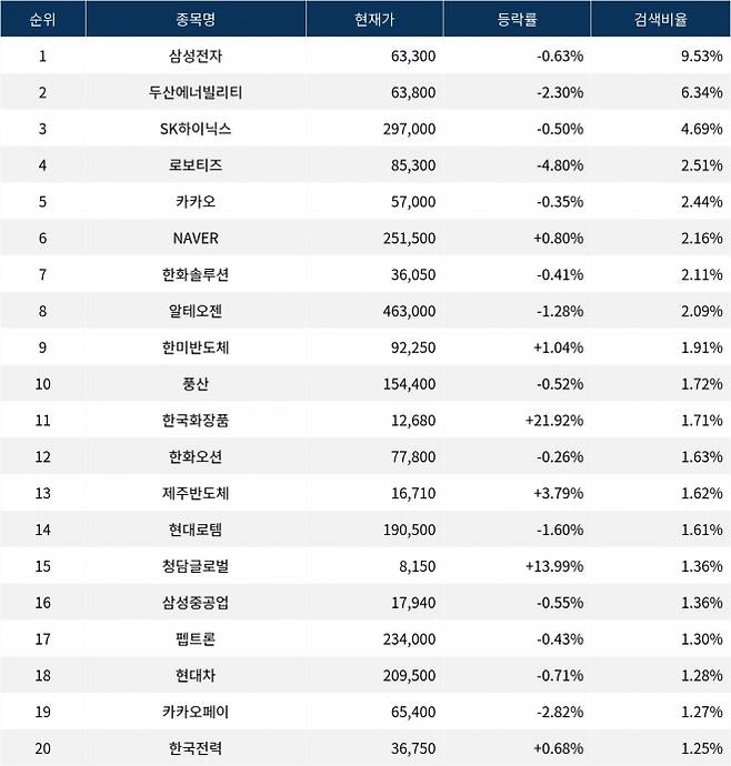 이어 두산에너빌리티(034020)가 검색비율 2위를 기록하며 2.30%의 하락세를 보이고 있다. 검색비율 3위인 SK하이닉스(000660)는 0.50% 하락하며 주춤한 모습을 보이고 있다. 검색비율 4위 로보티즈(108490)는 개장 초반부터 4.80%의 하락률로 하락세를 보이고 있다. 검색비율 5위 카카오(035720)는 0.35% 하락하며 큰 움직임을 보이지 않고 있다.