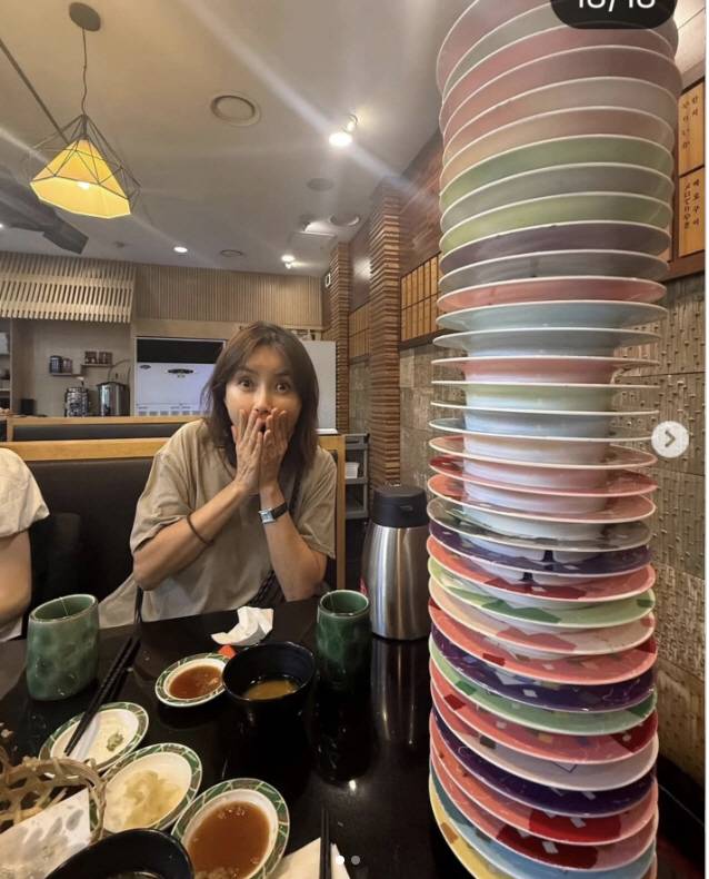 사진 속에는 스시집 접시 수십개가 쌓인 걸 보고 놀라는 신애라의 모습이 담겨 있다.