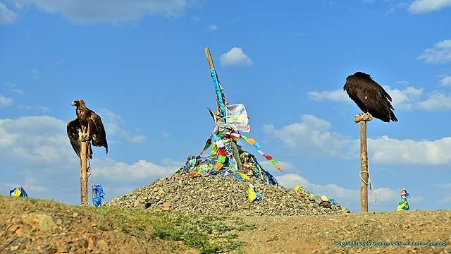 | ▲ 관광객들이 기념 사진을 촬영하도록 '어워' 옆에 독수리를 묶어놓았다. |
