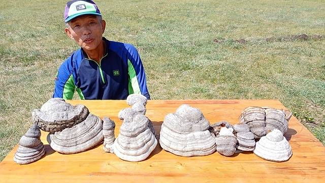 | ▲ 일행이 머무는 테렐지 캠핑장 인근에서 한 시간 정도 채취한 말굽버섯 앞에서 포즈를 취한 일행. 말굽 버섯은 죽은 자작나무에 기생한다. |