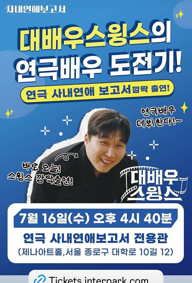스윙스는 오늘(16일) 오후 4시 40분 서울 대학로 제나아트홀에서 열리는 연극 '사내연애 보고서'에 특별 출연한다. 그는 SNS를 통해 팬들에게 데뷔 소식을 알렸다.