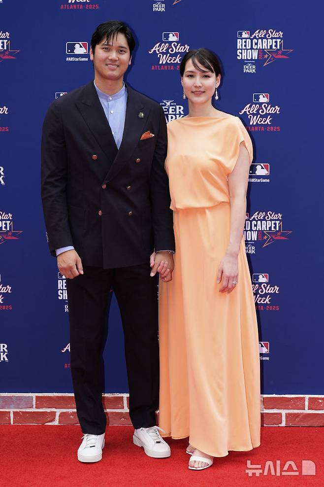 [애틀랜타=AP/뉴시스] LA 다저스의 오타니 쇼헤이와 아내 다나카 마미코가 15일(현지 시간) 미 조지아주 애틀랜타 트루이스트 파크에서 열리는 2025 메이저리그 올스타전 레드카펫 행사에 도착해 포토 타임을 갖고 있다. 2025.07.16.