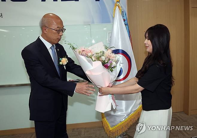 (세종=연합뉴스) 배재만 기자 = 조원철 법제처장이 16일 정부세종청사 법제처 대회의실에서 열린 취임식에서 직원 대표로부터 축하 꽃다발을 받고 있다. 2025.7.16