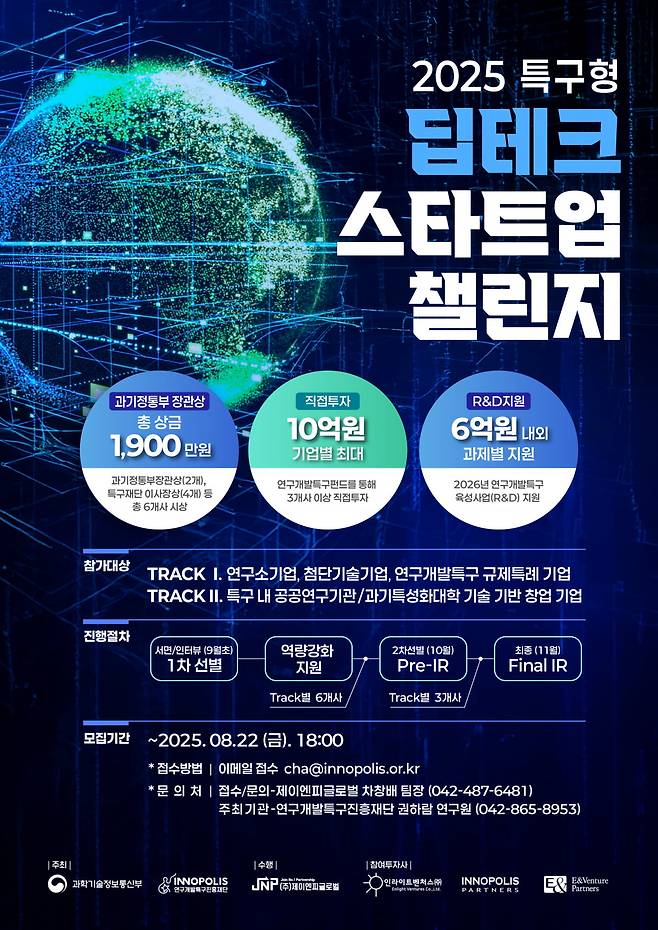 신청 자격은 딥테크 분야 사업화를 추진하는 기업 중 연구소기업·첨단기술기업·규제 특례기업 등 특구 제도권 기업(트랙 A)과 특구 내 공공연구기관 및 과학기술특성화대학 기술 기반 창업 7년 이내 기업(트랙 B)으로 구분해 모집한다.