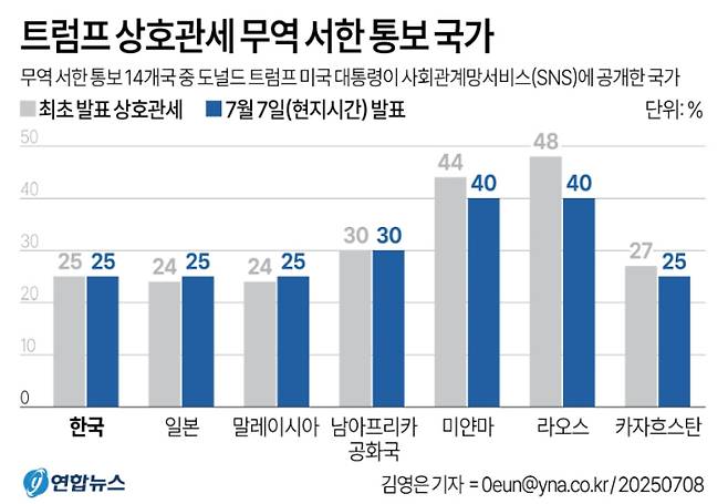 ◆ 김양희> 그렇죠, 관세율이. 더 중요하게는 한국, 일본 25. 그다음에 EU, 멕시코 30, 캐나다 35. 미국에서 중요한 나라들은 이 3개의 관세율로 압축됐다는 거예요.