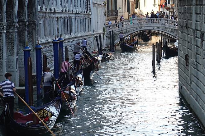 | ▲ 2025년 7월 3일(현지시간) 이탈리아 베네치아 탄식의 다리(Ponte dei Sospiri) 아래로 손님을 태운 곤돌라가 줄지어 가고 있다. |