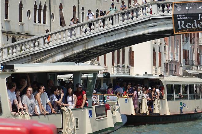 | ▲ 2025년 7월 3일(현지시간) 이탈리아 베네치아 페로비아(Ferrovia) 정류장 인근 수상버스에 탑승객이 가득 차 있다. |
