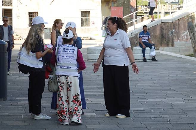 | ▲ 2025년 7월 4일(현지시간) 이탈리아 베네치아 피아찰레 로마(P.le Roma) 수상버스 정류장 인근에서 베네치아 입장료 관련 문구가 기재된 옷을 입은 관계자들이 이야기를 나누고 있다. |