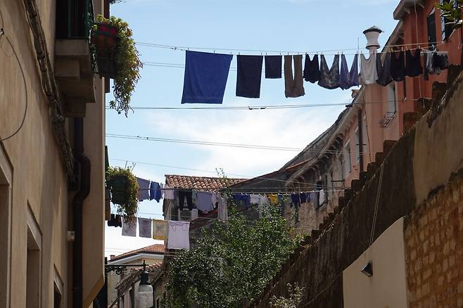 | ▲ 2025년 7월 3일(현지시간) 이탈리아 베네치아 골목에 빨래가 건물 사이에 연결된 빨랫줄에 걸려있다. |