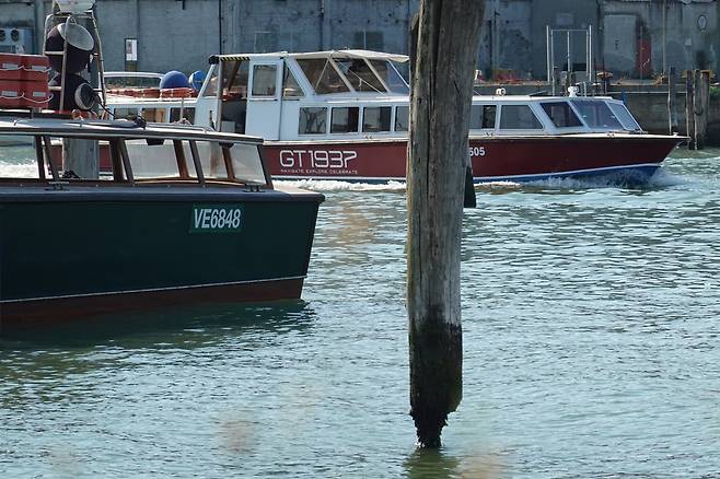 | ▲ 2025년 7월 4일(현지시간) 이탈리아 베네치아 트론케토(Tronchetto) 수상버스 정류장 인근 수면 근처가 깊게 깎여나간 통나무 뒤로 배가 지나가고 있다. |